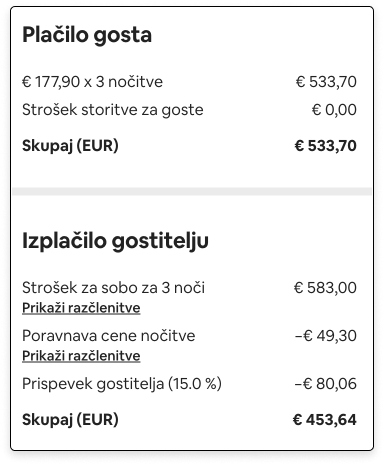 Gost je v zgornjem primeru plačal platformi AirBnB 533,70 €. Gostitelj na svoj TRR račun dobi celoten znesek brez 15 % prispevkov gostitelja oz. AirBnB provizij. Gostitelj bo na račun torej dobil 453,64 €.
