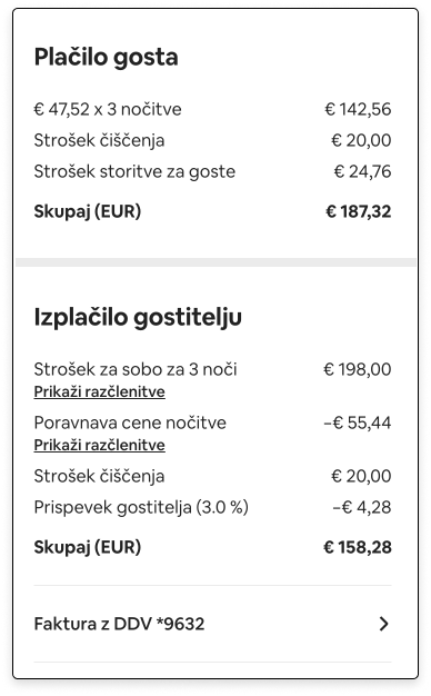 Gost je AirBnBju plačal 187,32 €. Ta znesek vključuje strošek čiščenja (20,00 €) in strošek storitve (provizije), ki ga plača gost (24,76 €).